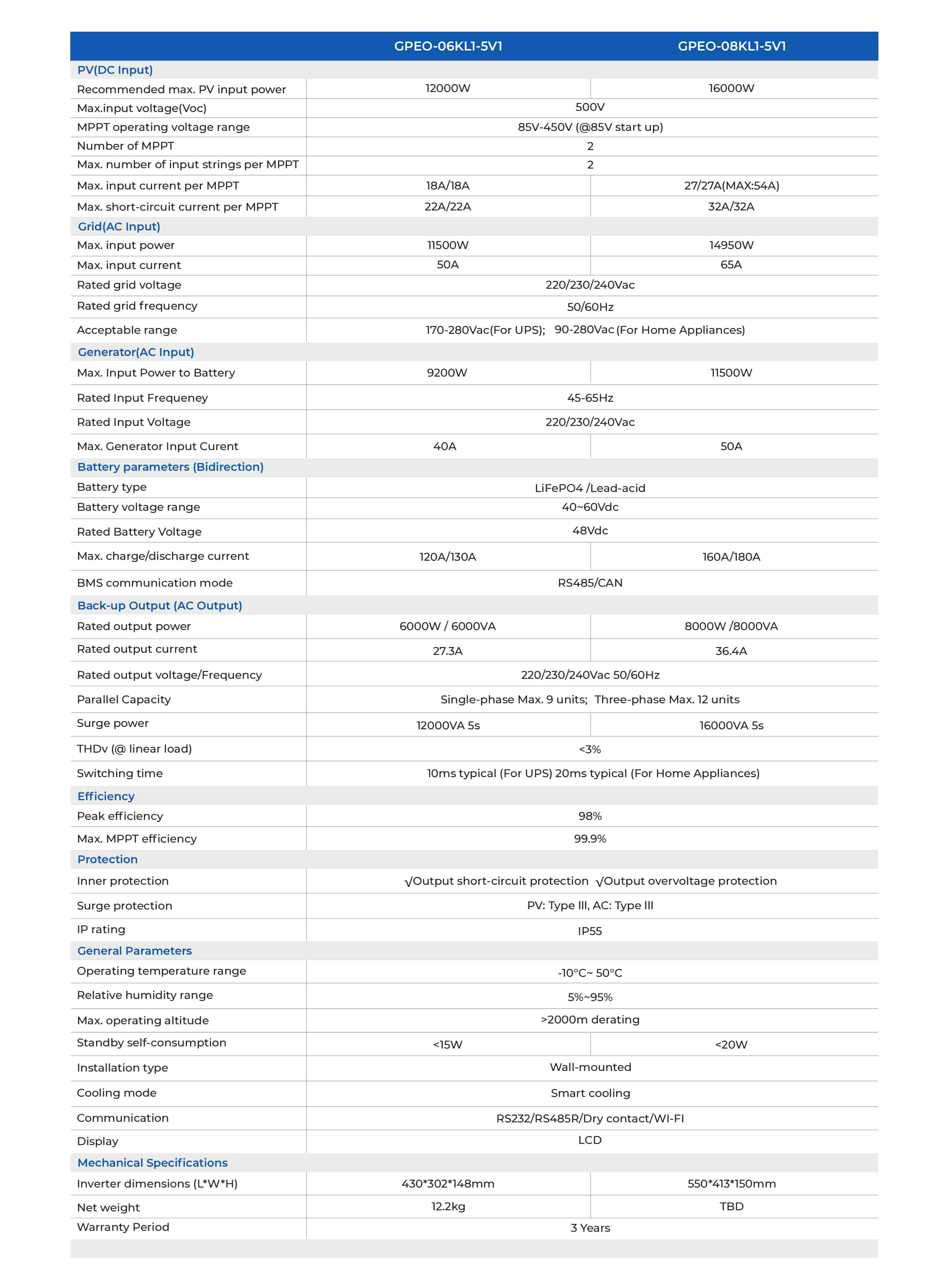The Gospower GPEO-08KL1-5V1 pure sine wave solar inverter integrates with built-in BMS communication, the inverter enables seamless monitoring and management of battery performance. Capable of parallel operation with up to 12 units, it offers scalability to meet growing energy demands. Backed by 3-year warranty, users can trust in its durability and longevity.