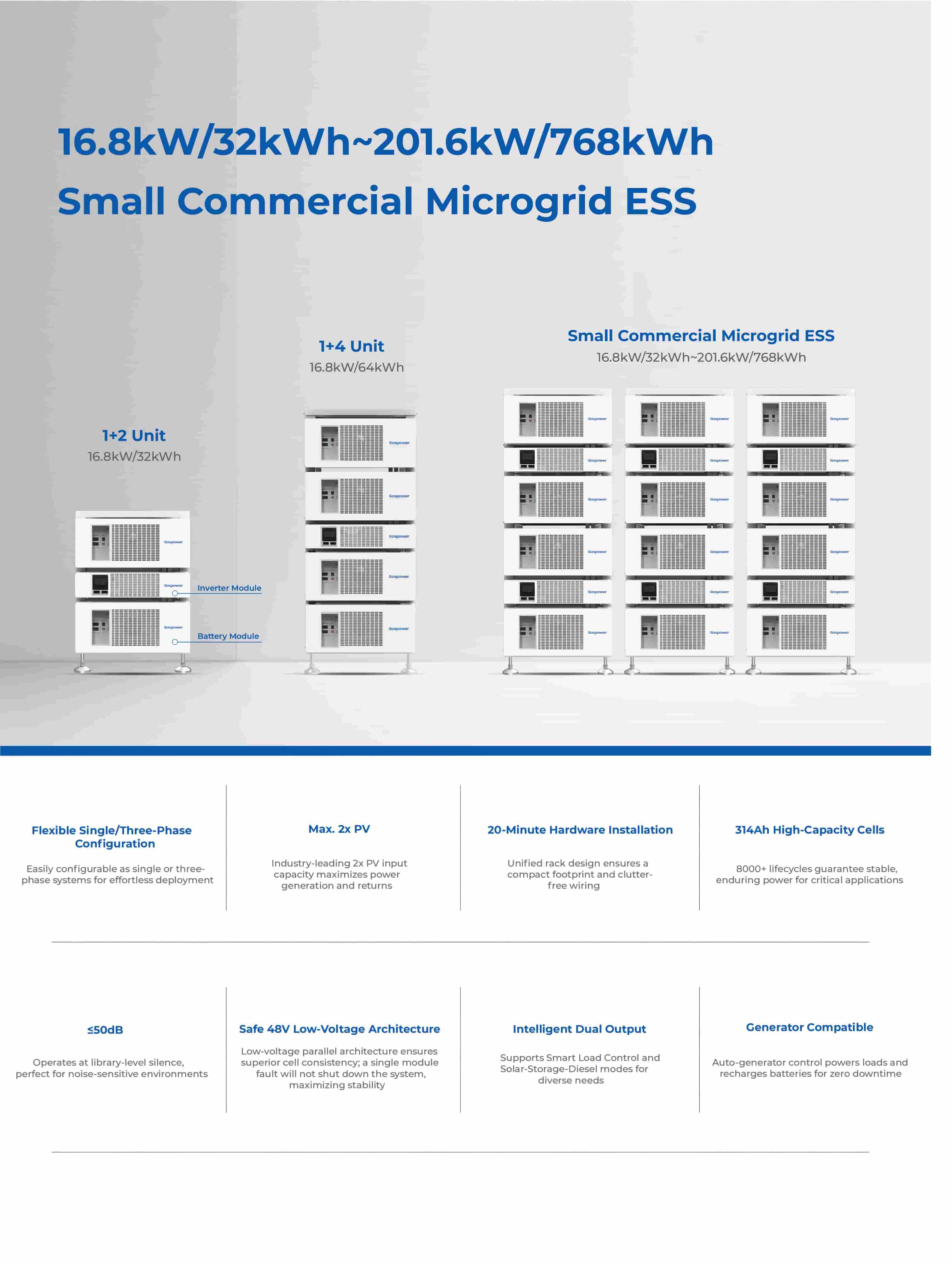 Gospower Small Commercial Microgrid Energy Storage System (ESS) covers a wide capacity range from 16.8kW/32kWh up to 201.6kW/768kWh.