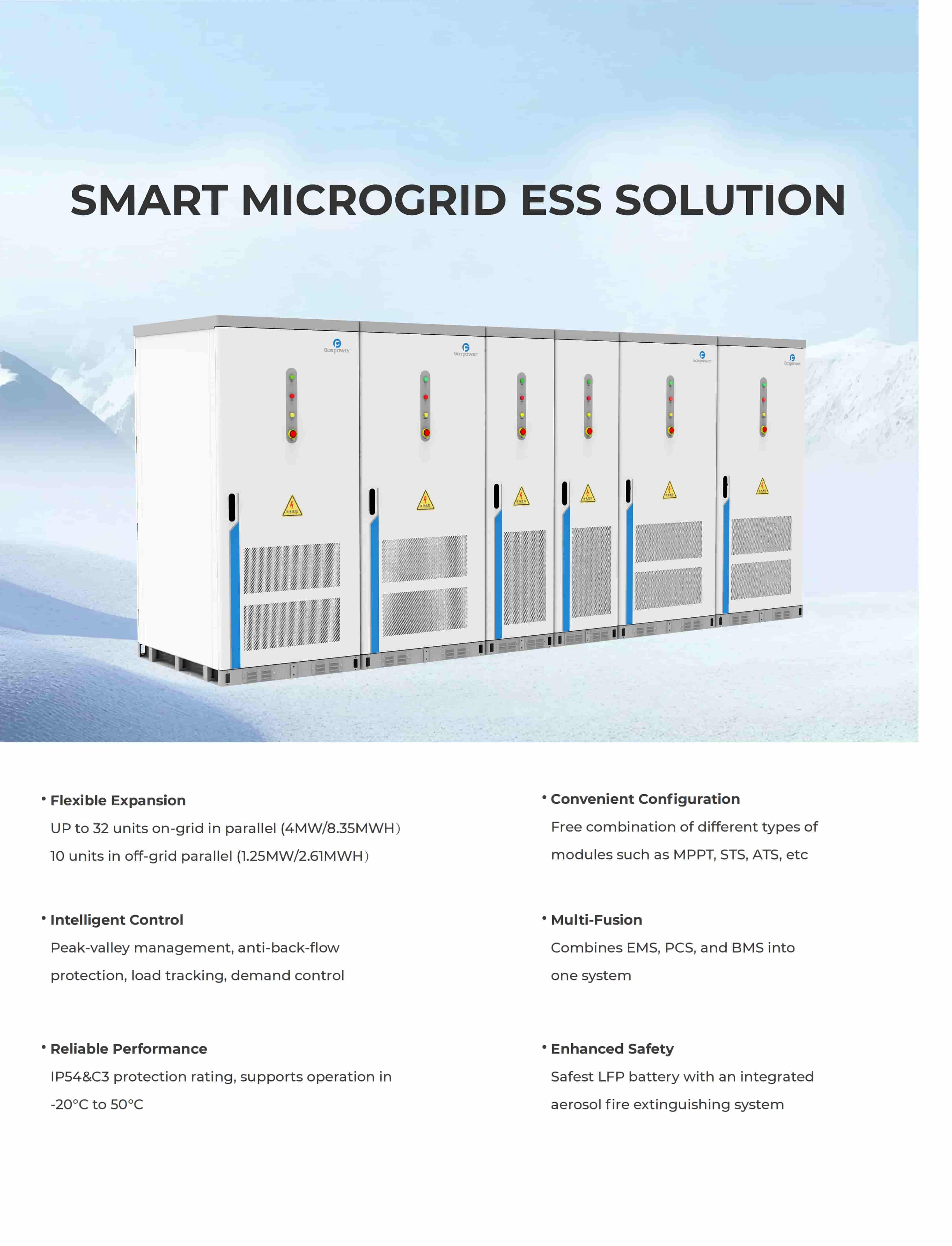 Gospower Smart Microgrid Energy Storage System (ESS) is an all-in-one integrated energy solution that combines EMS (Energy Management System), PCS (Power Conversion System) and BMS (Battery Management System) into a single high-performance platform.